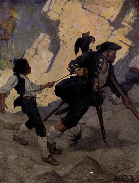 In Treasure Island, Long John Silver is a pirate who was quartermaster under the notorious Captain Flint. Long John Silver had a pet parrot called Captain Flint, often seen sitting on his shoulder where she would nibble on seeds. A quartermaster on a pirate ship ranked higher than any officer except the captain himself, and could veto the captain's decisions whenever the ship was not in a battle. The quartermaster was elected by the crew and one of his tasks was to lead the boarding party from the quarterdeck during boarding attacks. Silver claims to have served in the Royal Navy and lost his leg under "the immortal Hawke". "His left leg was cut off close by the hip, and under the left shoulder he carried a crutch, which he managed with wonderful dexterity, hopping about upon it like a bird. He was very tall and strong, with a face as big as a ham – plain and pale, but intelligent and smiling." He claims to have been the only man whom Flint ever feared. Like many of Stevenson's characters, there is more than a modicum of duality in the character; ostensibly Silver is a hardworking and likeable seaman, and it is only as the plot unfolds that his villainous nature is gradually revealed. His relationship with Jim Hawkins, the novel's protagonist, is interesting, as he serves as a mentor and eventually father-figure to Jim, creating much shock and emotion when it is discovered that he is in charge of the mutiny, and especially when Jim must confront and fight him later on. Although willing to change sides at any time in the interests of his own survival, Silver has compensating virtues: he is wise enough to pay attention to money management, in contrast to the spendthrift ways of most pirates, and is physically courageous despite his disability; for instance, when Flint's cache is found to be empty, he coolly stands his ground against five grown men despite having only Hawkins to back him.