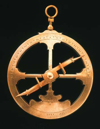 This 16th century astrolabe is used to find their way across the great oceans of the world. Invented around the end of the 15th century, it enabled seamen to navigate by the sun and the North Star, measuring their altitude above the line of the horizon. The astrolabe and the compass were the source of main navigation for over 200 years.