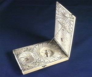 The truly amazing device, ? was created in Germany in the 17th century, served as kind of a compendium of instrument for calculating time & direction. The upper two leaves shows the times of day and planetary hours, as well as relative position of the planets. The lower leaf shows latitude measurments for Europe. A piece of string, known as "gnomon" stretched between the upper and lower leaf and was used to take measurments.